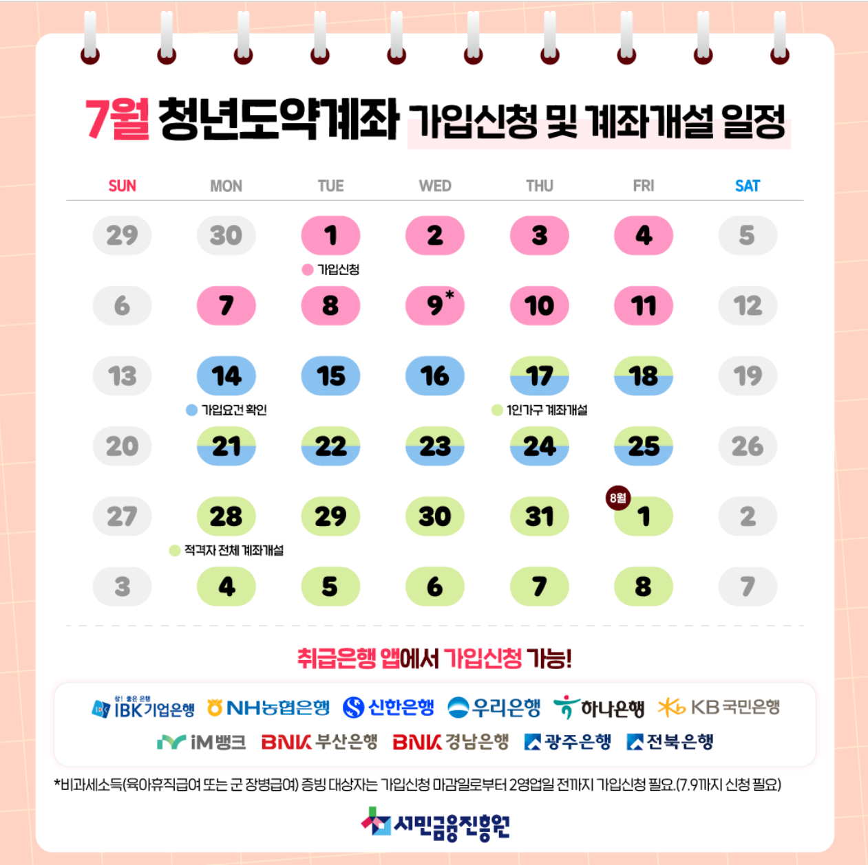 7월 청년도약계좌 가입신청 및 계좌개설 일정이 공지되었으니 놓치지 마시고 꼭 메모해 두세요.